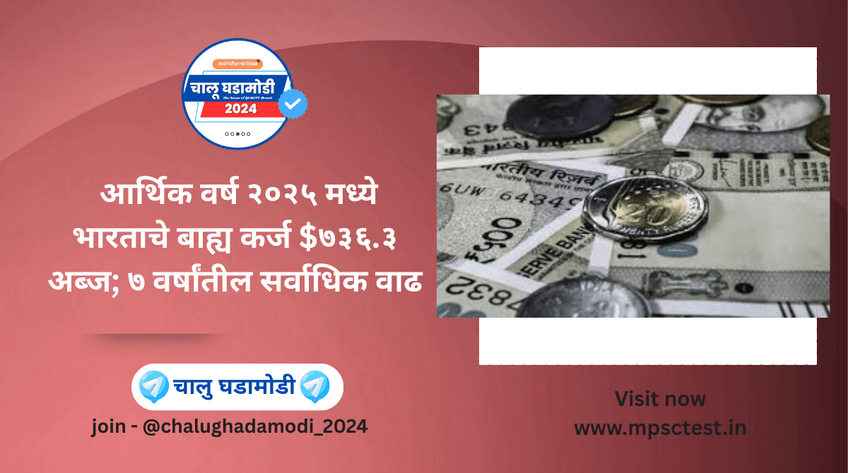 भारताचे बाह्य कर्ज – $७३६.३ अब्ज (मार्च २०२५) : भारताचे बाह्य कर्ज विक्रमी वाढीसह $७३६.३ अब्जांवर (मार्च २०२५)