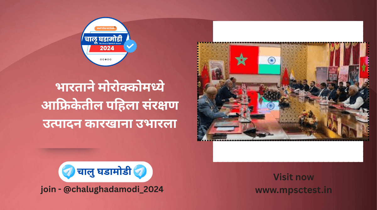 भारत मोरोक्को संरक्षण उत्पादन कारखाना : भारताने मोरोक्कोच्या बेरेचिडमध्ये आपला पहिला संरक्षण उत्पादन कारखाना सुरू करून “आत्मनिर्भर भारत” उपक्रमाला जागतिक स्तरावर चालना दिली आहे. हा प्रकल्प टाटा अॅडव्हान्स्ड सिस्टम्स मारोक द्वारे स्थापित करण्यात आला असून, येथे व्हील्ड आर्मर्ड प्लॅटफॉर्म्स तयार केले जातील. हा आफ्रिकेत भारताचा पहिला संरक्षण उत्पादन प्रकल्प आहे, ज्यामुळे भारताच्या जागतिक संरक्षण उद्योगातील उपस्थिती मजबूत होईल.