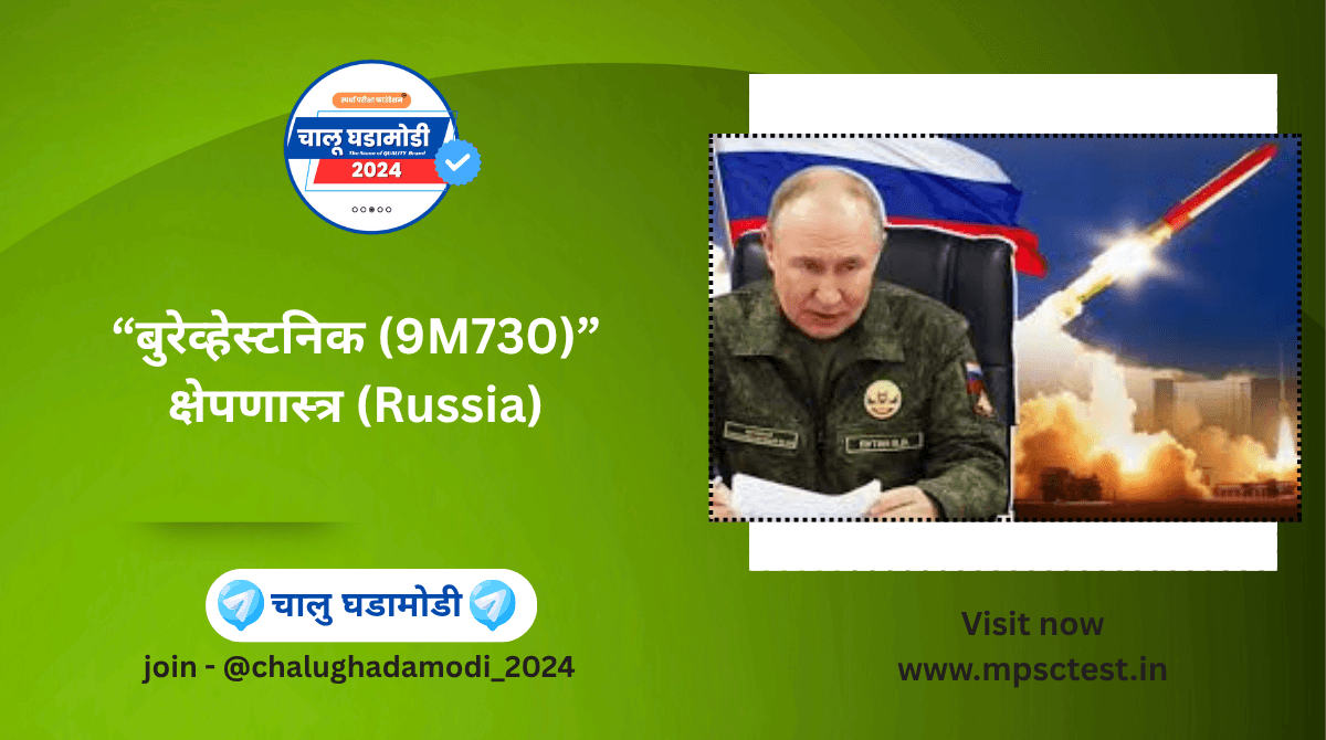 घोषणा: रशियाचे अध्यक्ष व्लादिमीर पुतिन यांनी अणुऊर्जेवर चालणाऱ्या 9M730 “बुरेव्हेस्टनिक” क्रूझ क्षेपणास्त्राच्या यशस्वी चाचणीची घोषणा केली.