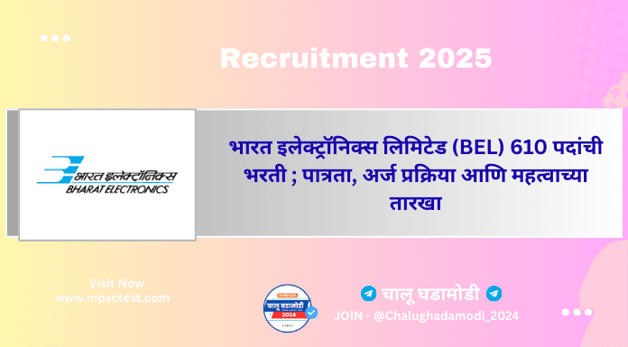 BEL भरती 2025 : भारत इलेक्ट्रॉनिक्स लिमिटेड (BEL) मध्ये विविध पदांसाठी भरती प्रक्रिया सुरु झाली आहे. इच्छुक व पात्र उमेदवारांना ऑनलाईन अर्ज करण्याचे आवाहन करण्यात आले आहे.