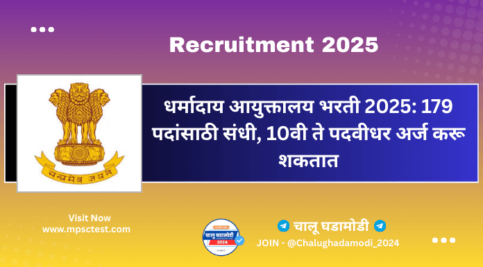 Dharmaday Ayuktalay Bharti 2025 : धर्मादाय आयुक्तालय, महाराष्ट्र यांनी 179 पदांसाठी भरतीची जाहिरात प्रसिद्ध केली आहे. 10वी पासपासून ते पदवीधरांपर्यंत उमेदवारांना यात संधी आहे.