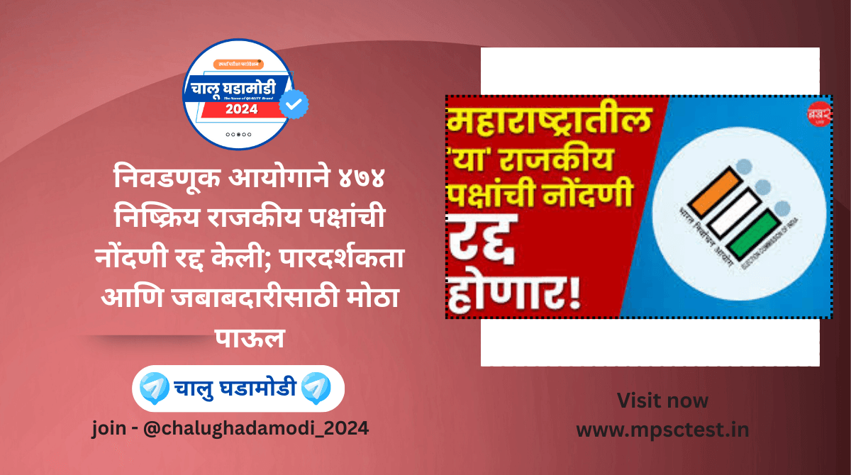 Election Commission of India (ECI) : भारतीय निवडणूक आयोगाने (ECI) देशाच्या राजकीय व्यवस्थेत पारदर्शकता आणण्यासाठी एक मोठे पाऊल उचलले आहे. आयोगाने असे ४७४ नोंदणीकृत, पण मान्यता नसलेले राजकीय पक्ष (RUPPs) यांची नोंदणी रद्द केली आहे, जे गेल्या सहा वर्षांत ना कोणतीही निवडणूक लढले, ना त्यांच्या आर्थिक हिशोबांचे लेखापरीक्षण केलेले अहवाल सादर केले. फक्त दोन महिन्यांच्या आत एकूण ८०८ पक्षांची नोंदणी रद्द झाली असून, यामुळे भारतातील निष्क्रिय राजकीय पक्षांची संख्या लक्षणीयरीत्या कमी झाली आहे.