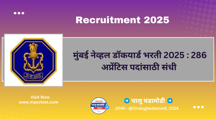 Naval Dockyard Mumbai Recruitment 2025 : मुंबई नेव्हल डॉकयार्डने अप्रेंटिस (प्रशिक्षणार्थी) पदासाठी मोठी भरती जाहीर केली आहे. या भरतीसाठी 08वी/10वी उत्तीर्ण तसेच संबंधित ट्रेडमध्ये ITI धारक उमेदवार अर्ज करू शकतात.