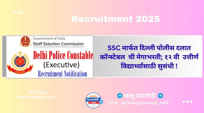 SSC Delhi Police Constable Recruitment 2025 : कर्मचारी निवड आयोग (SSC) मार्फत दिल्ली पोलीस कॉन्स्टेबल (Executive) पदासाठी तब्बल 7565 जागांची मोठी भरती जाहीर झाली आहे. 12वी उत्तीर्ण उमेदवारांसाठी ही उत्तम संधी आहे. इच्छुक उमेदवारांनी ऑनलाईन अर्ज करणे आवश्यक आहे.