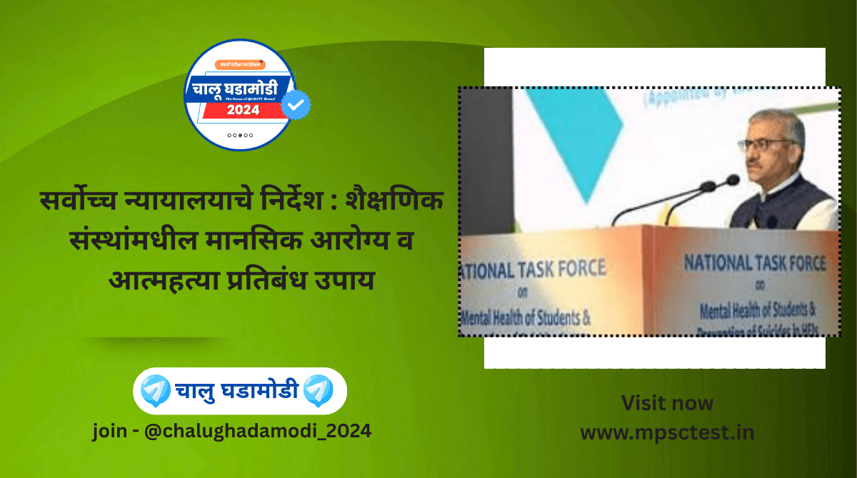 → ८ आठवड्यांत आत्महत्या प्रतिबंध व मानसिक आरोग्य मार्गदर्शक तत्त्वांवरील अंमलबजावणी अहवाल सादर करण्याचे निर्देश दिले.कारण : विद्यार्थ्यांमधील आत्महत्यांचे वाढते प्रमाण व मानसिक आरोग्य चौकटींची आवश्यकता.